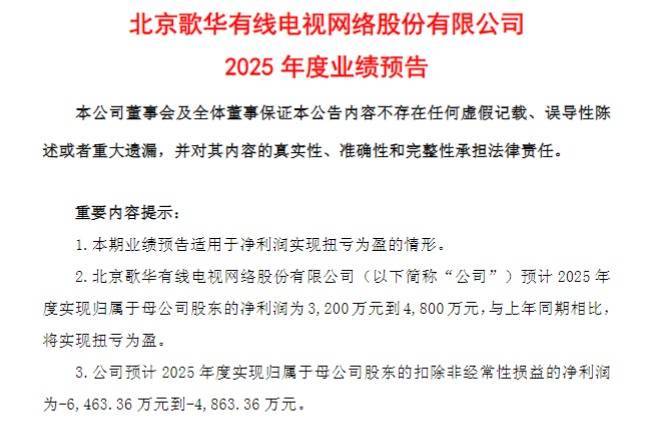 近期,歌华有线(600037.SH)发布2025年度业绩预告,公司预计实现归母净利润3200万元至4800万元,与上年同期相比,实现扭亏为盈。